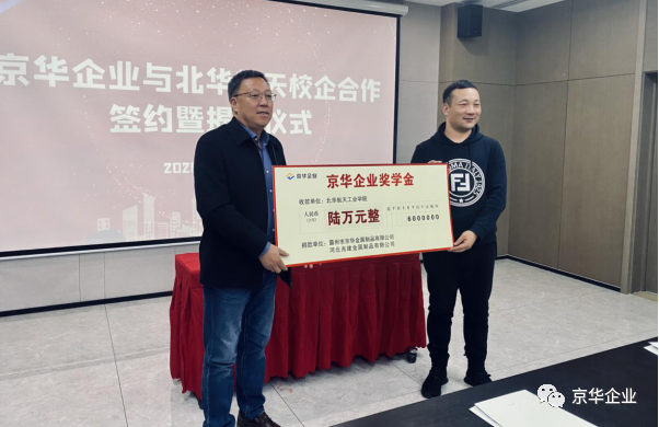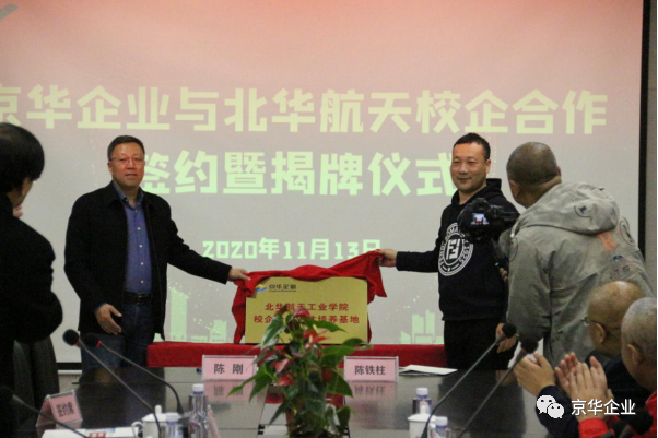 揭牌儀式上,北華航天工業(yè)學(xué)院校長陳剛、京華企業(yè)總經(jīng)理陳鐵柱一起為此次校企合作揭牌。