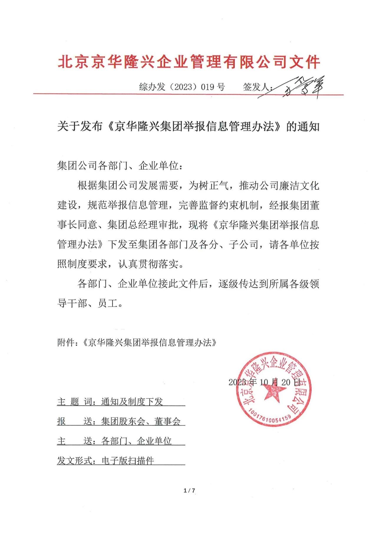 各合作單位、產(chǎn)品供應(yīng)商:根據(jù)我公司發(fā)展需要,為進(jìn)一步推動我公司內(nèi)部的廉潔文化建設(shè),也為了保障貴單位在與我公司合作過程中的公平公正,確保合作共贏,現(xiàn)公布集團(tuán)文件《京華隆興集團(tuán)舉報信息管理辦法》,請各合作單位悉知。